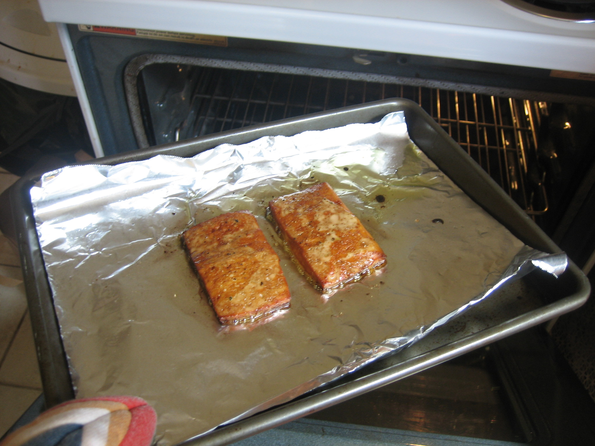 Line a small baking sheet with aluminum foil.  Pour a couple teaspoons of olive oil on the foil and spread it around with your fingers (or a pastry brush if you must).  sprinkle ground pepper on both sides of the tofu and put on the baking sheet.  Drizzle with a little more oil.  Bake at 400 degrees for 20 minutes.