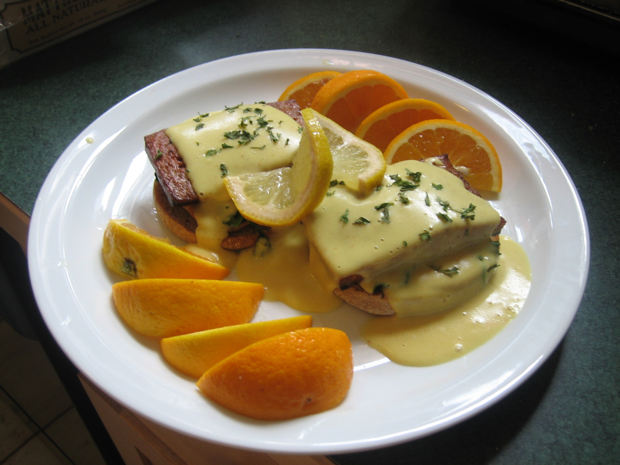 Then garnish with some chopped parsley, cut fruit and a lemon twist and you’ve got yourself a delicious hybrid of eggs Benedict and eggs Florentine made vegan.
