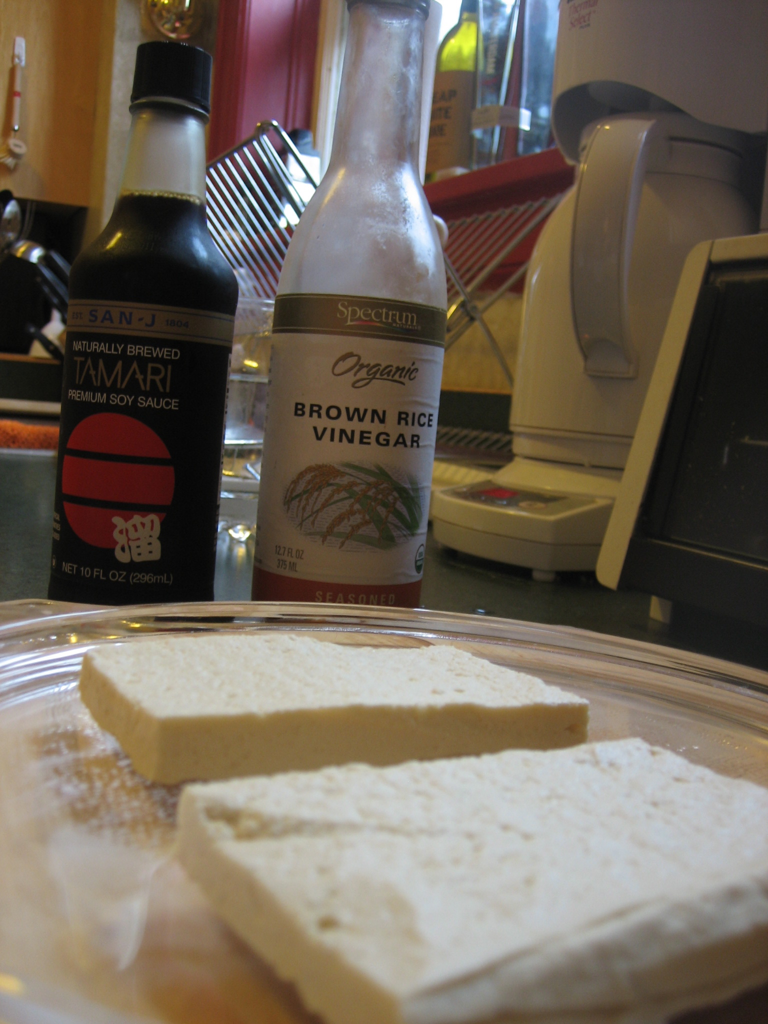 Next is the marinade.  Slice your tofu down the middle (the short way) so you have two rectangles.  Place the slices on a plate (I used the same one with which I pressed the tofu.)  MarinadePour your tamari and rice vinegar on top of your tofu and swish it all around with your hands to mix it up and get all sides of the tofu slices covered.  The strength of the marinade is up to you.  If you like it a little saltier, use the full amount of tamari and less vinegar.  If you like it a little more sour, use less tamari and more vinegar.  I use the full amount of both, but you can be the judge.  Also, you want there to be enough marinade on the plate so the tofu sucks it up really well.