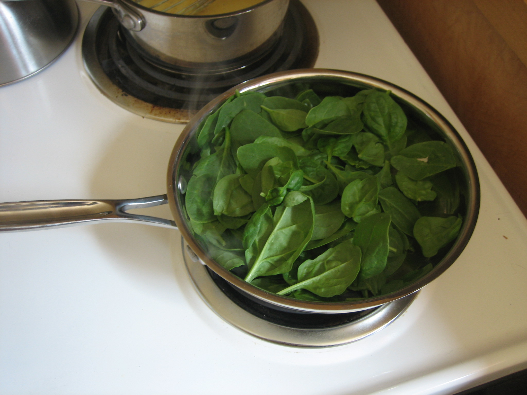Heat 1-2 teaspoons of olive oil in a small skillet (about 8 inches) over medium heat.  Add a big handful of spinach, more or less filling the pan as it cooks down a lot.  pan o spinachCook until the spinach is wilted.
