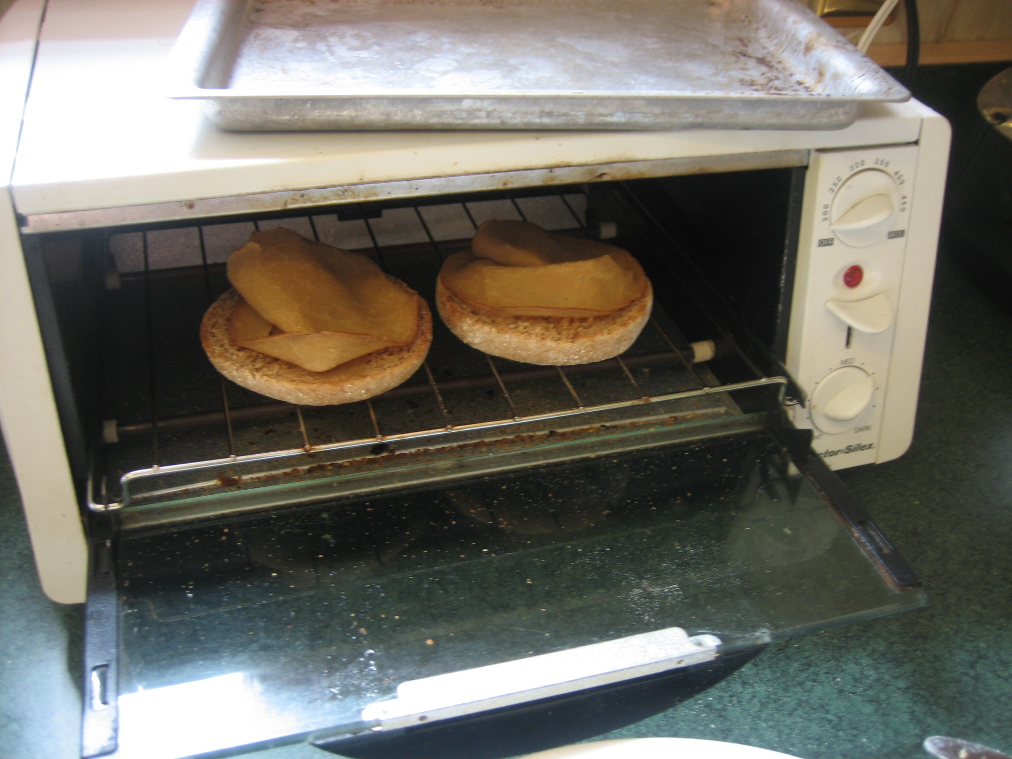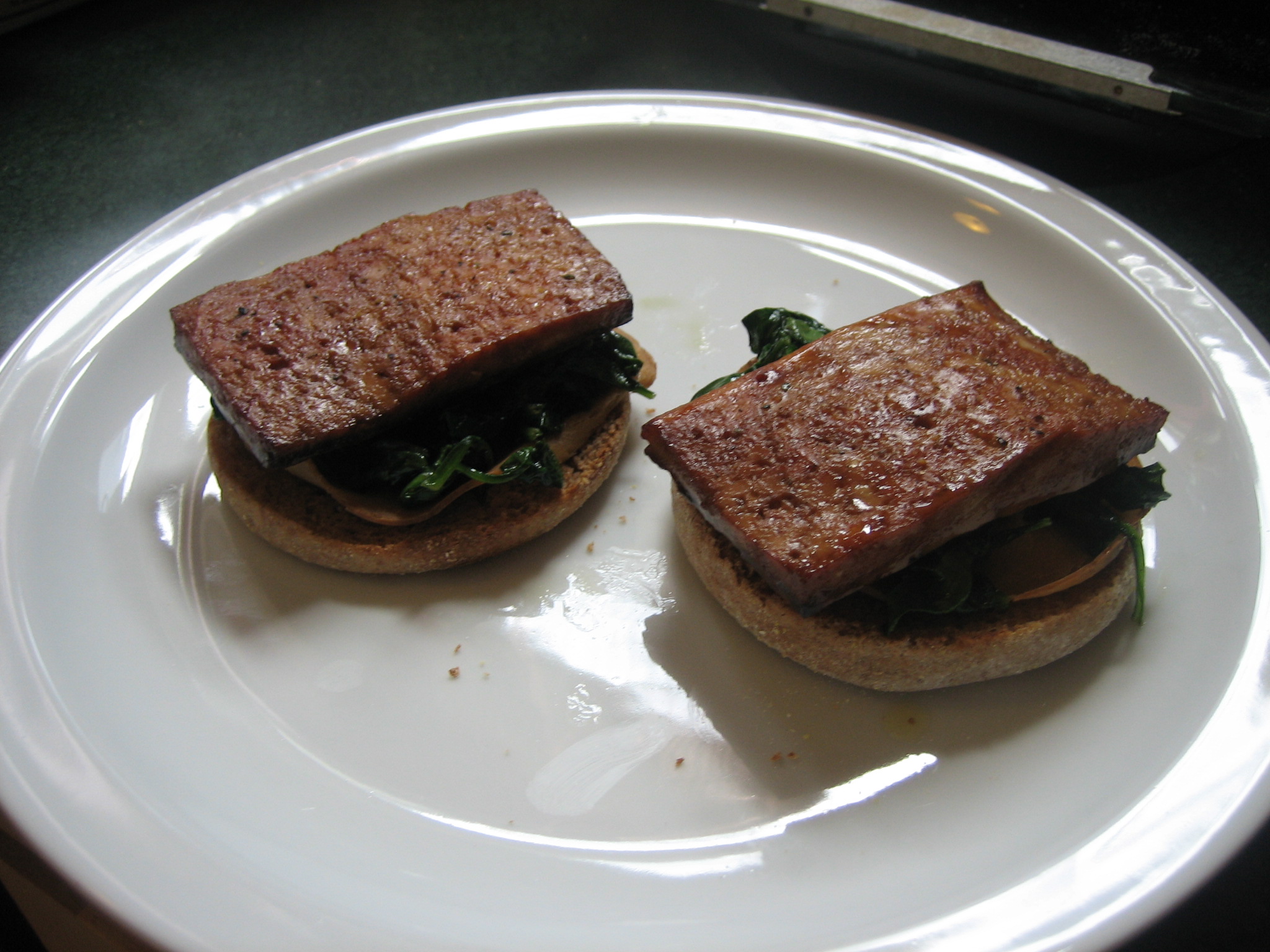 Meanwhile, toast your English muffin.  When toasted, butter it!  To heat up my smoky vegan meaty subsititute, I placed slices of smoked tofurky on my English muffins and put them back in the toaster oven.  If you don’t have a toaster oven (I suggest you get one, first off), you can use your full size oven to get your muffin/meaty combo all toasty.