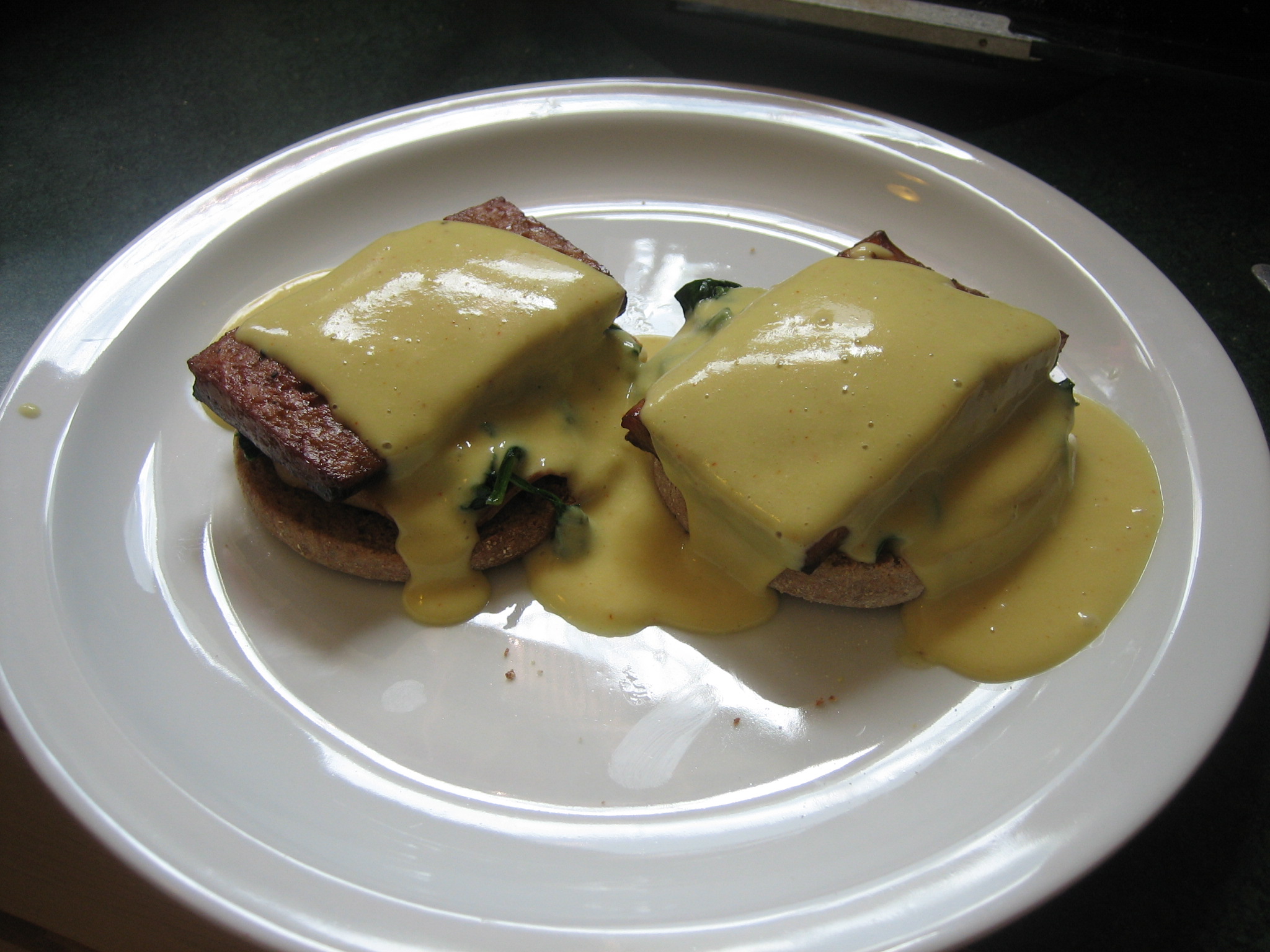 rain rain go awayIt’s a rainy day here in Northern Minnesota, so I figured that it was the perfect day to make a hybrid, vegan version of Benedict and Florence.  This took some planning.  While the English muffin, spinach, and even ham portions were easy to sub out for, the egg and the Hollandaise were going to be issues.