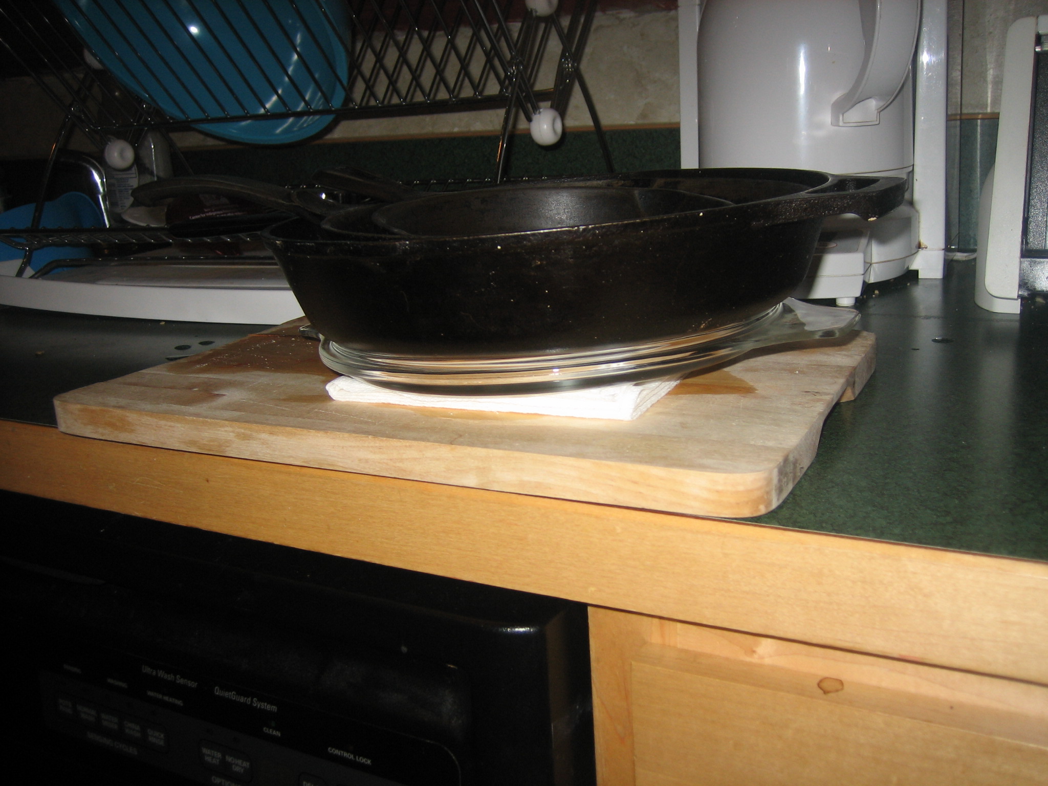 pressing tofuFirst of all, press your tofu.  Wrap it in either a good thick wad of paper towels (I used about 5 layers on each side of the tofu, folded of course), or a clean, cotton, folded kitchen towel.  Set the wrapped tofu on your cutting board and put a heavy plate on top and add more weights on top of that.  I use my stack of cast iron frying pans, but you can use a pot of water or canned goods if you can stack them high enough.  Allow the tofu to press like this for 10 to 15 minutes.