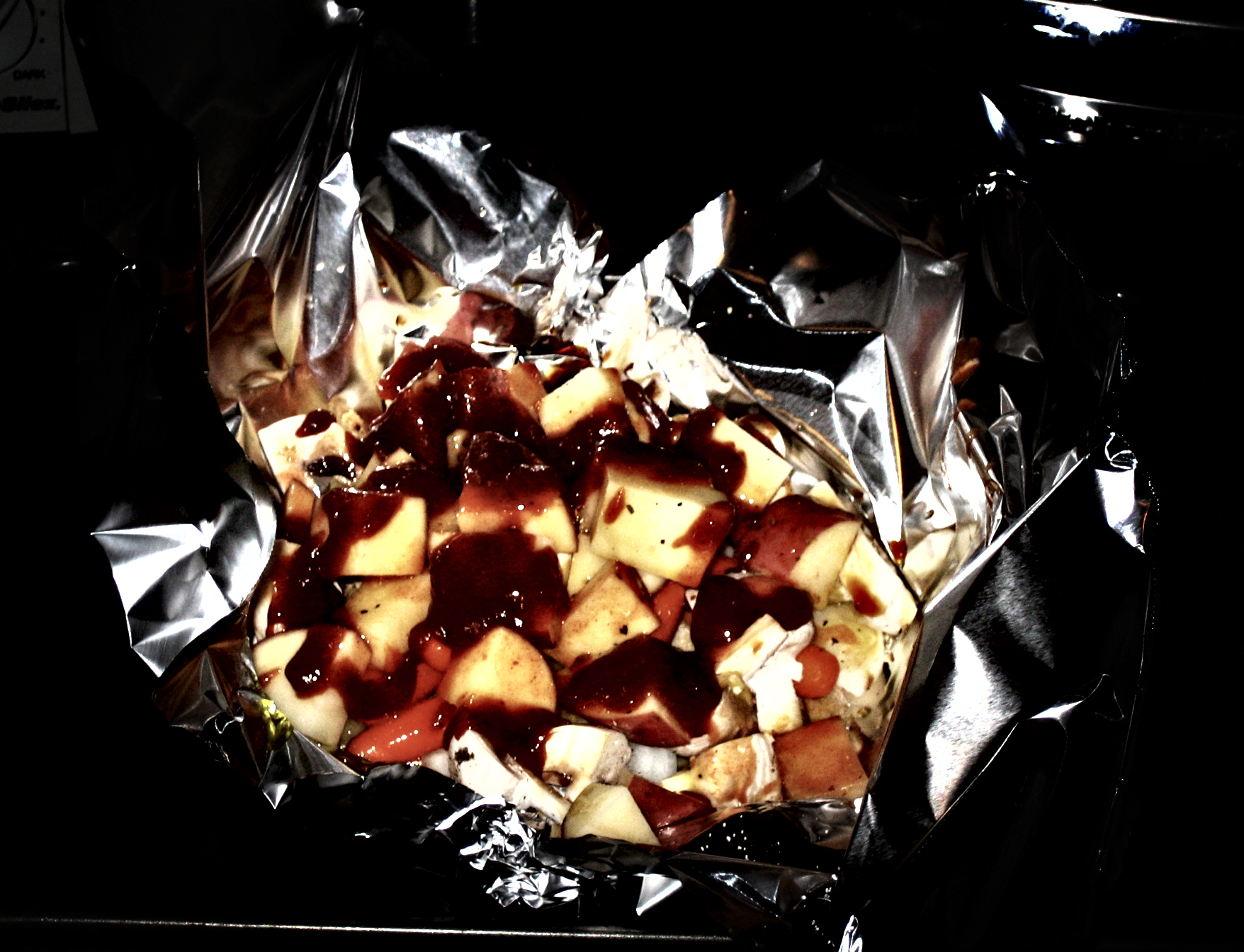 Drizzle everything with a good dose of olive oil, a tablespoon or two. Next shake on some soy sauce. Just a teaspoon or so. Then, pour on 2 to 3 tablespoons of the barbecue sauce. Lastly, add some hot sauce if you’d like to give it a kick. It’s okay that all of this ends up on the potatoes. It all slides down through the vegetables, picking up flavor on the way, and simmers through your protein of choice. Because the packet is sealed, it circulates all the flavors are locked in and sort of percolate through your food.
