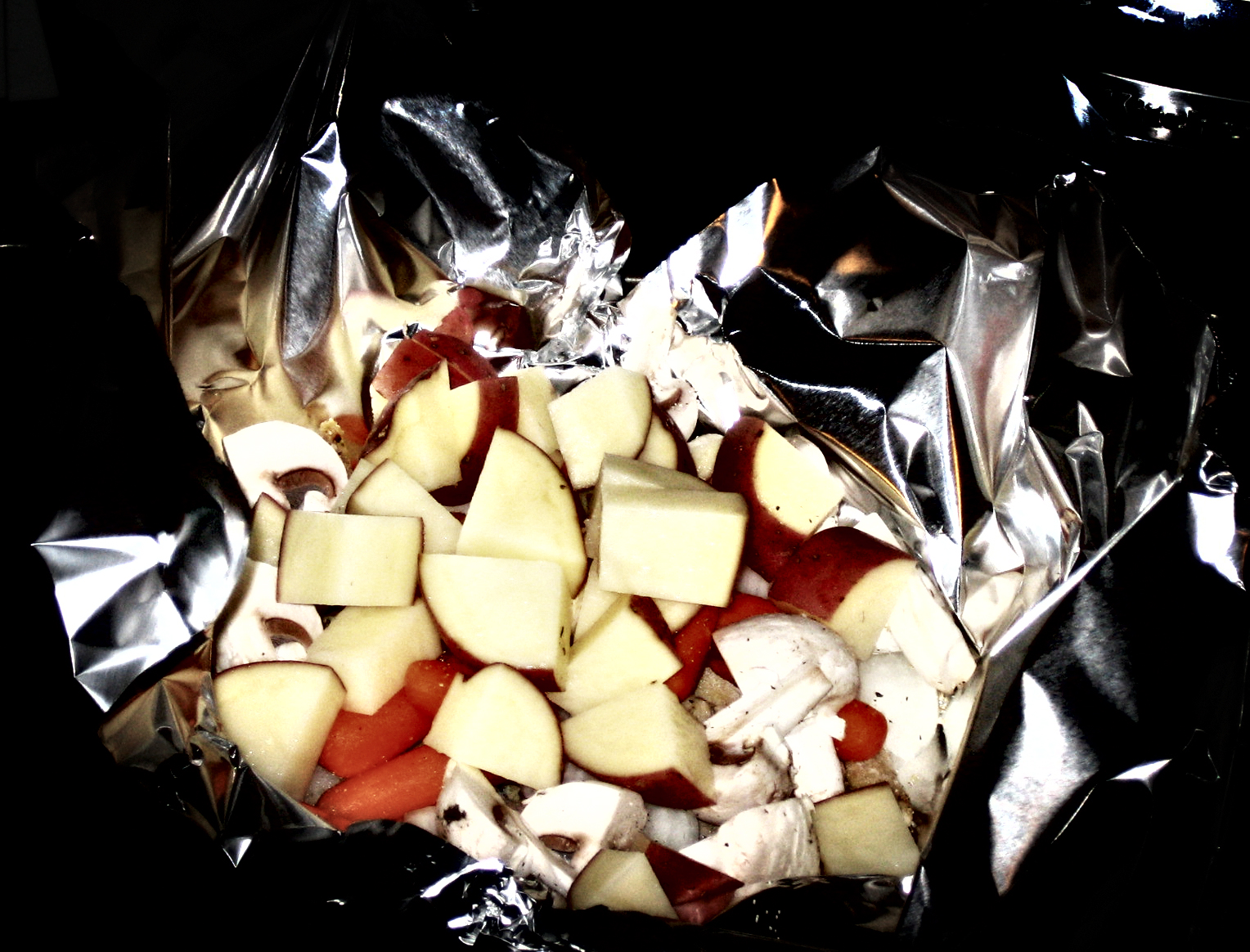 I make my hobo packets with two components, the food component and the sauce component. When all the vegetables cook in the packet, they leak out flavor all over the place and add to the flavor of the sauce that ends up in the bottom of the packet. I layer my ingredients in a specific way . . . kind of. They fall all over the place anyway, so it doesn’t really matter.
