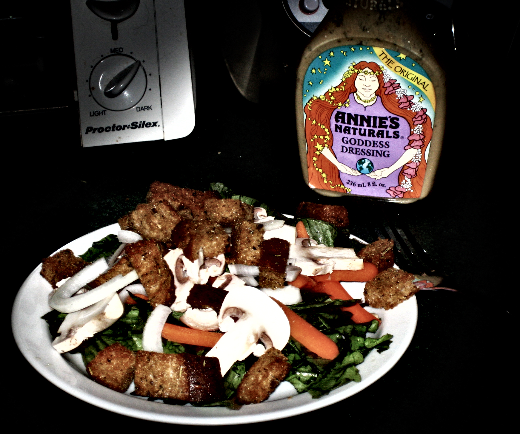 - Vegan Meaty substitute, either a patty made of 1/4 tube of light life hamburger substitute or 1/2 a bag of Morningstar Farms chik’n strips (or try other things . . . whatever you have laying around, really)