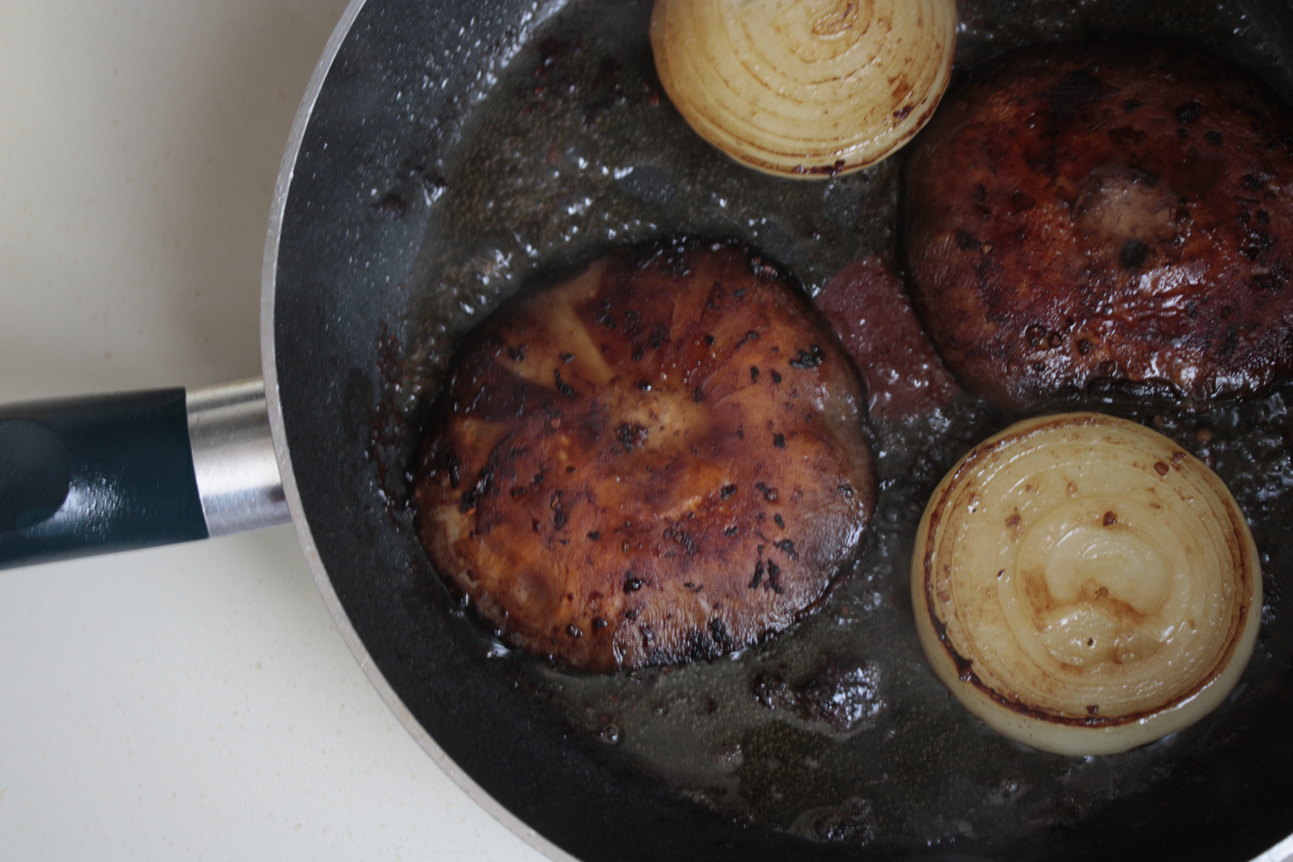 If you’re making the roasted potatoes with this sandwich, it’s best to start the mushrooms marinating and then deal with the potatoes and get them in the oven. Once the potatoes have baked for 20 minutes, you can put your mushrooms and onions in the pan. Then it all comes together quite nicely.