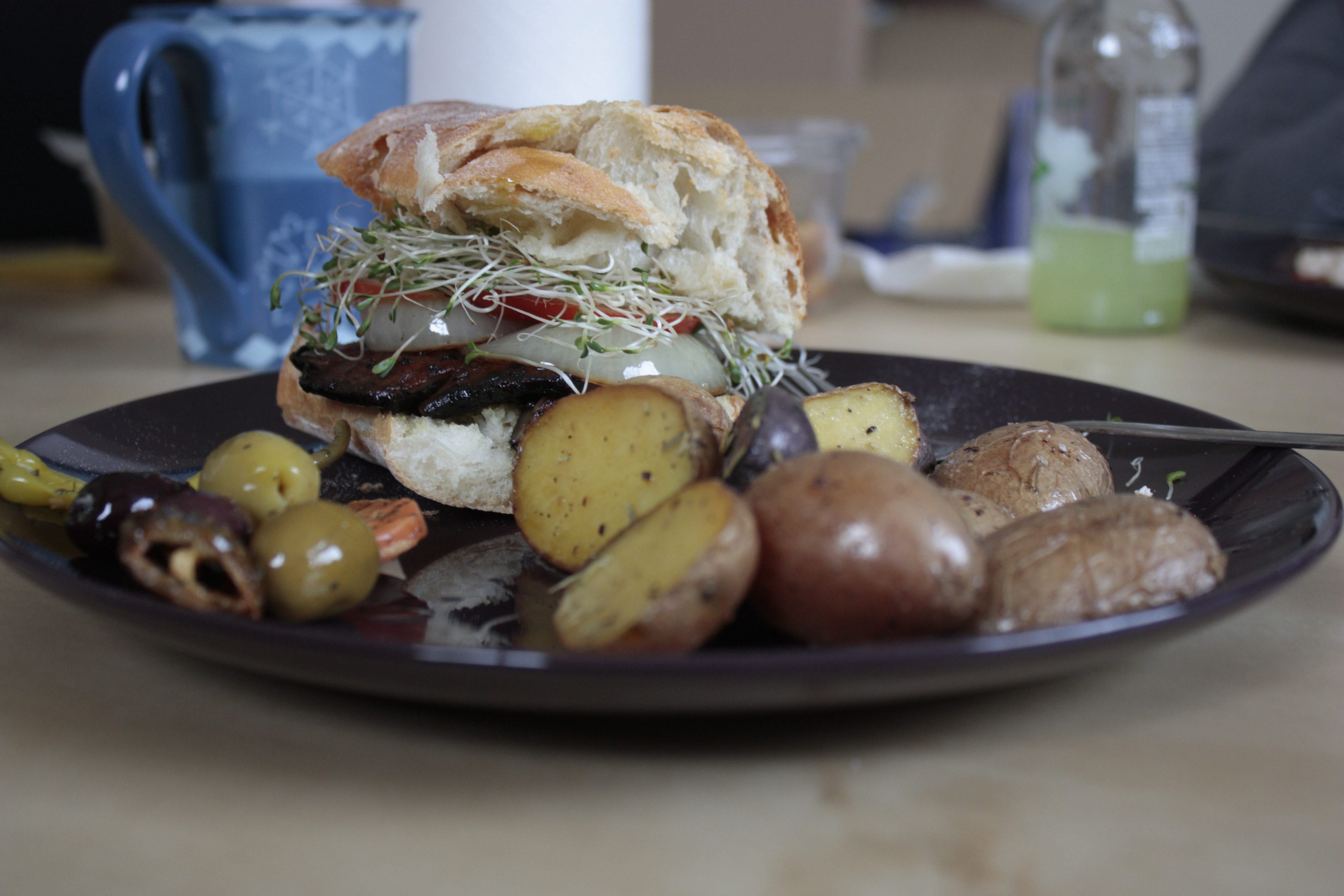 The day I came up with this recipe, something struck me. It’s easy. It tastes good. The ingredients are readily available. And it’s certainly not your typical, pedestrian, just plain bad portabella mushroom sandwich. That, and the side dish: rosemary roasted fingerling potatoes balances out the strong, salty mushroom. They have almost a creamy texture and flavor.