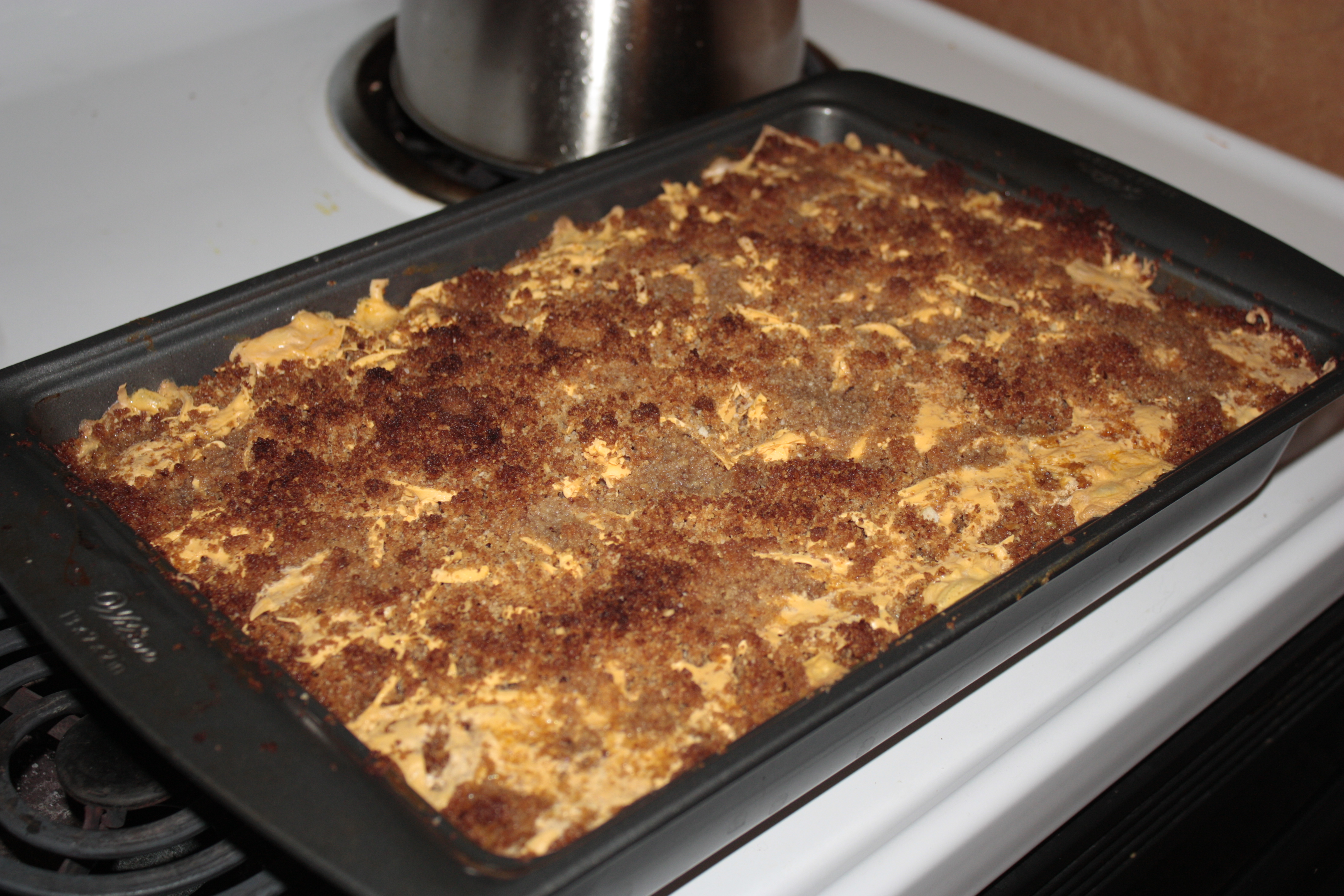 Sprinkle about half the breadcrumbs evenly on top of the macaroni, making sure to get the crumbs all the way to the edges. On top of this layer, evenly disperse the rest of the Teese, again being sure to get it along the edges so it gets all crusty and brown and tasty . . . mmm. Lastly, sprinkle the rest of the breadcrumbs on top of the Teese.